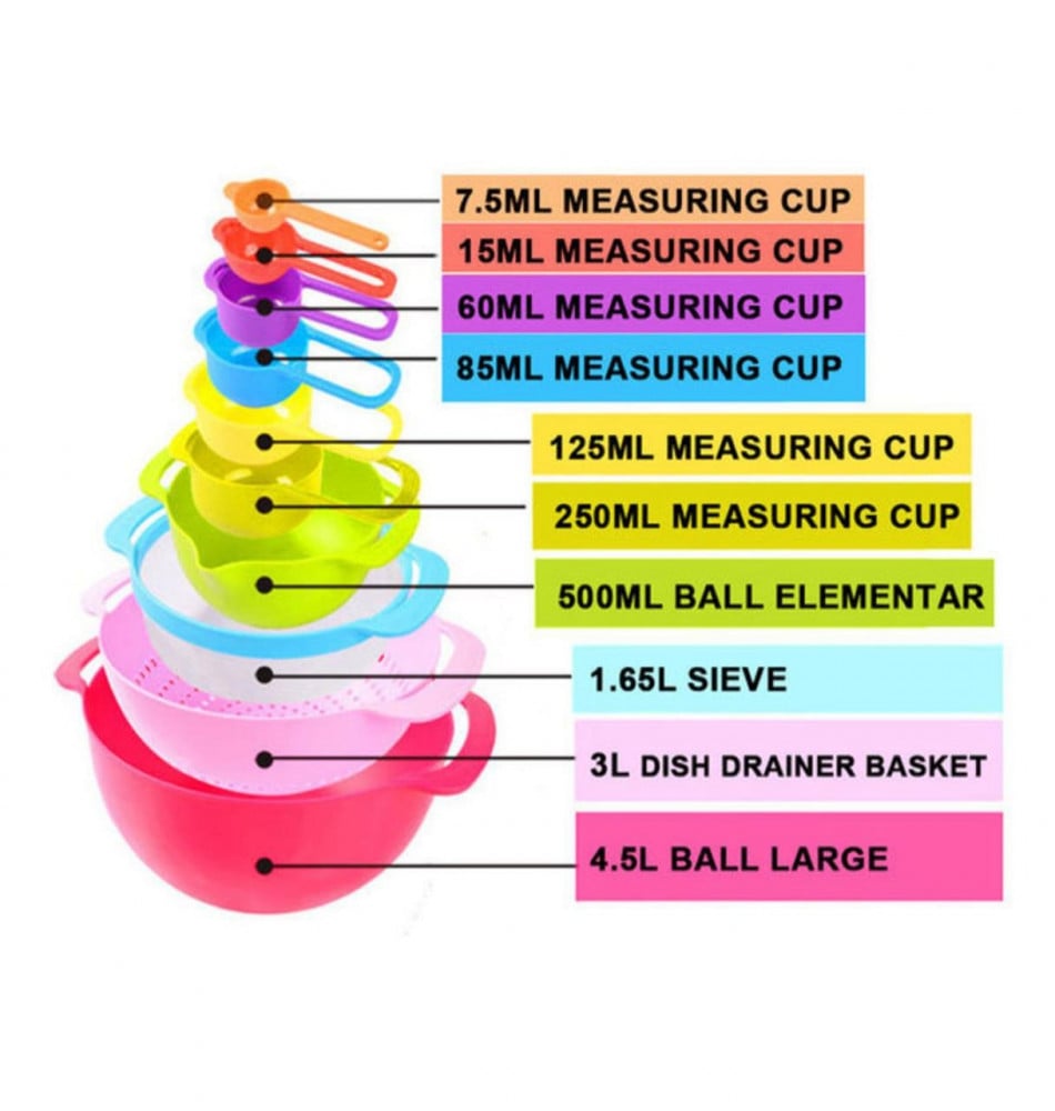 • تتضمن المجموعة 10 قطع: وعاء خلط كبير، ومصفاة، مصفاة غربال من النايلون، ووعاء خلط صغير بقياسات داخليه؛ 1 كوب، و1/2 كوب، و80 مل، و60 مل، و15 مل من أكواب قياس، وملعقة كبيرة واحدة. الألوان المختلفة تجعل من السهل تمييز كل أداة وإنشاء جو مريح في المطبخ ! مجموعة مثالية للطبخ أو الخبز.